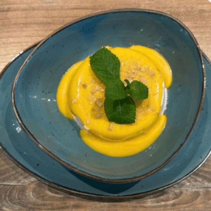 Vietnamesischen Kokoscreme mit echter Vanille, Mangopüree und gerösteten Erdnüssen