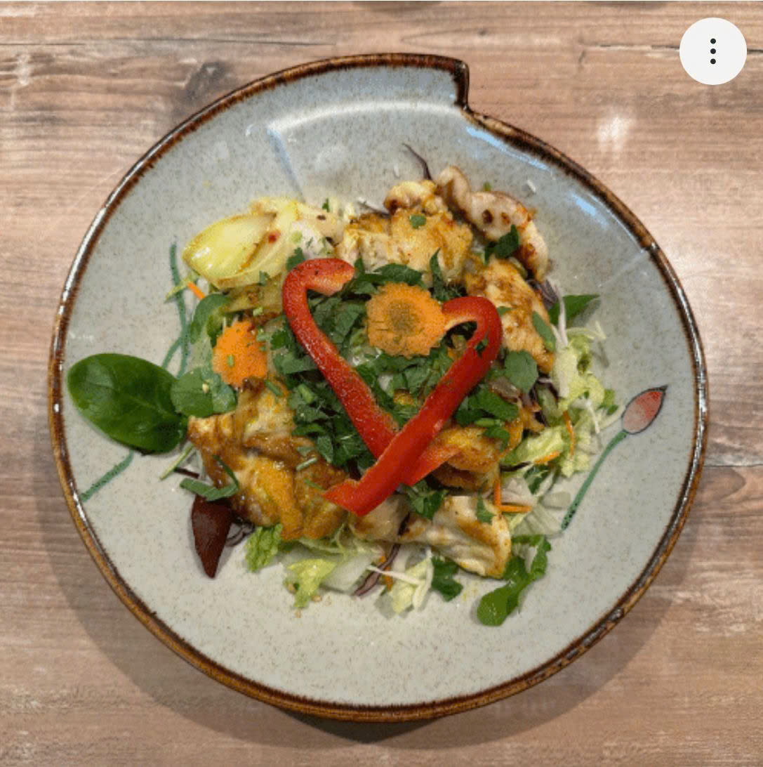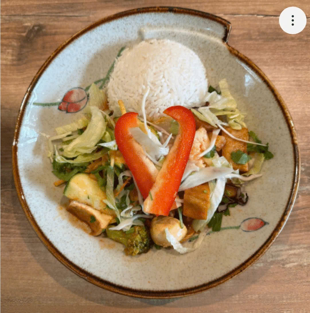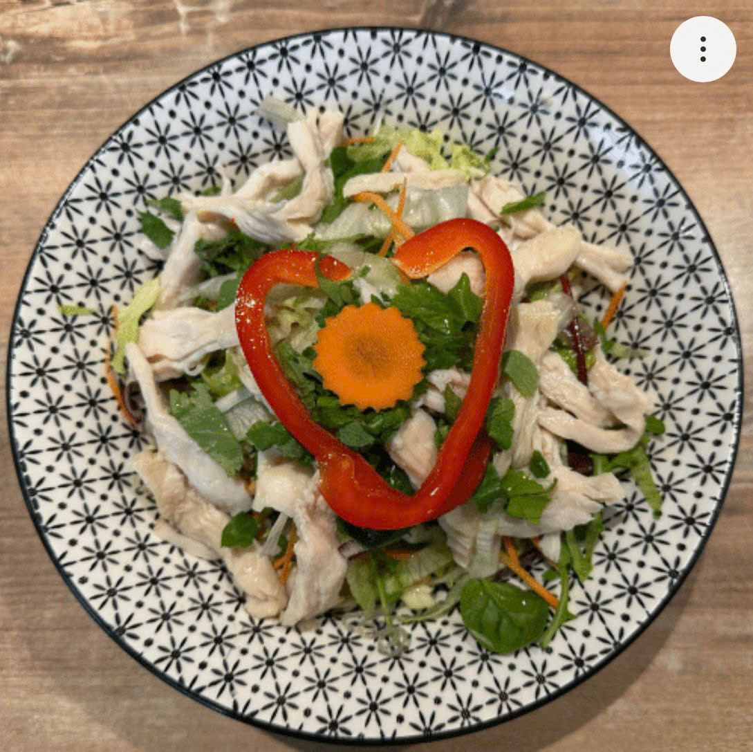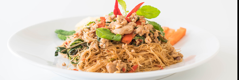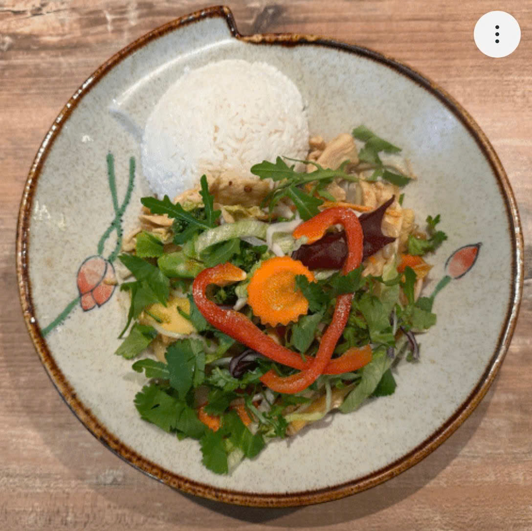Mit Zitronengras-Chili gewürztes Hühnerfleisch im heißen Wok gebraten, serviert mit Reisnudeln, Salat, Sojasprossen, Minze sowie Koriander in leckerer lngwer-Chili-Fischsoßen, verfeinert mit Erdnüssen.