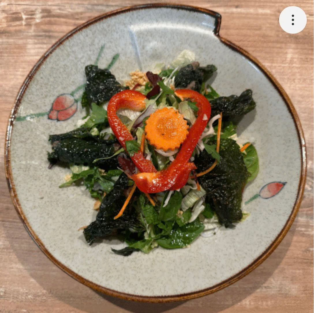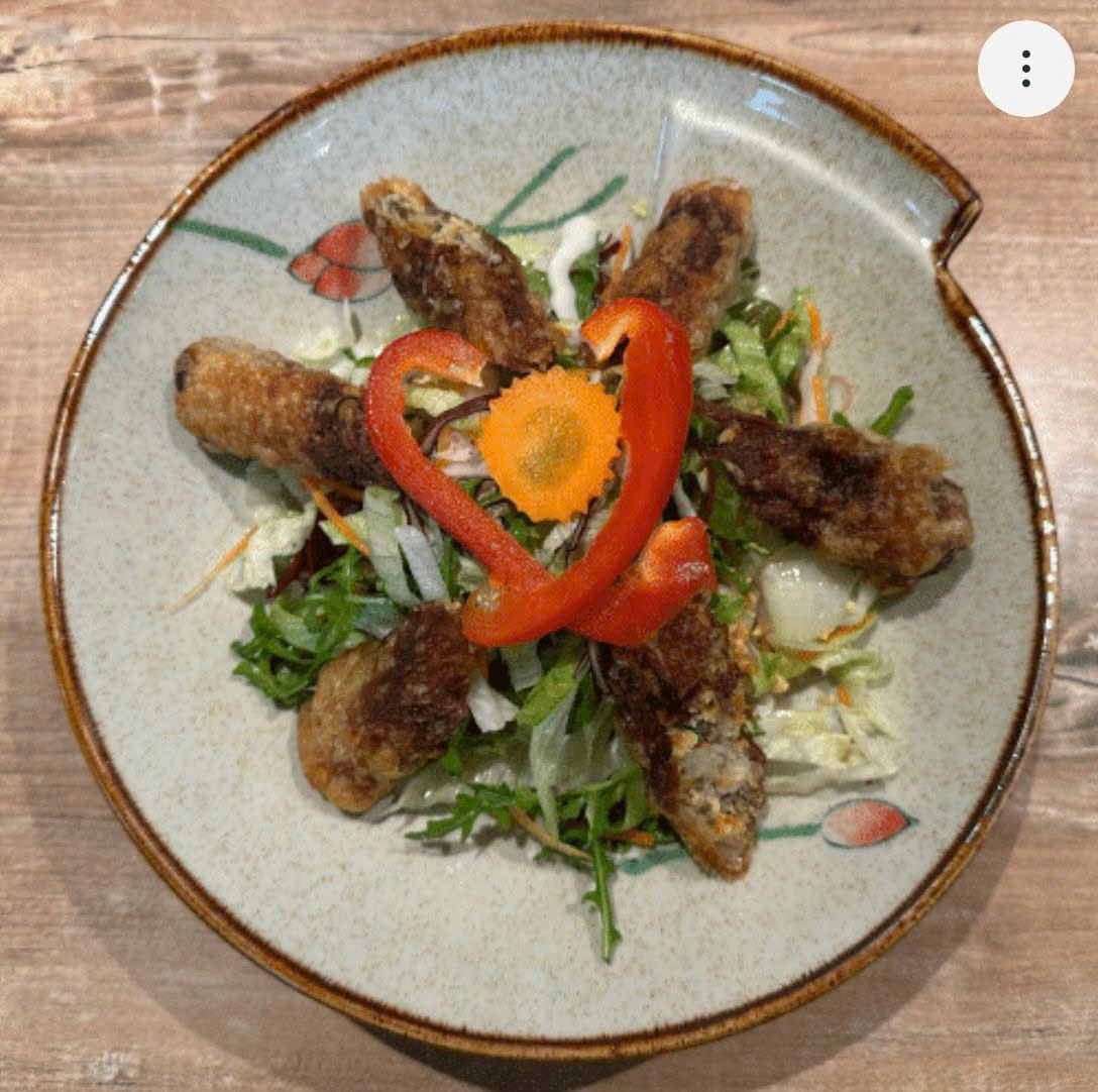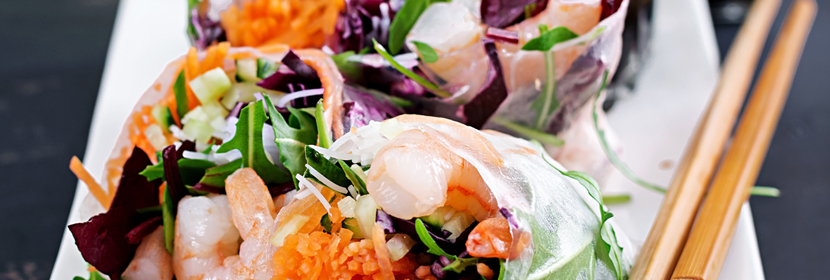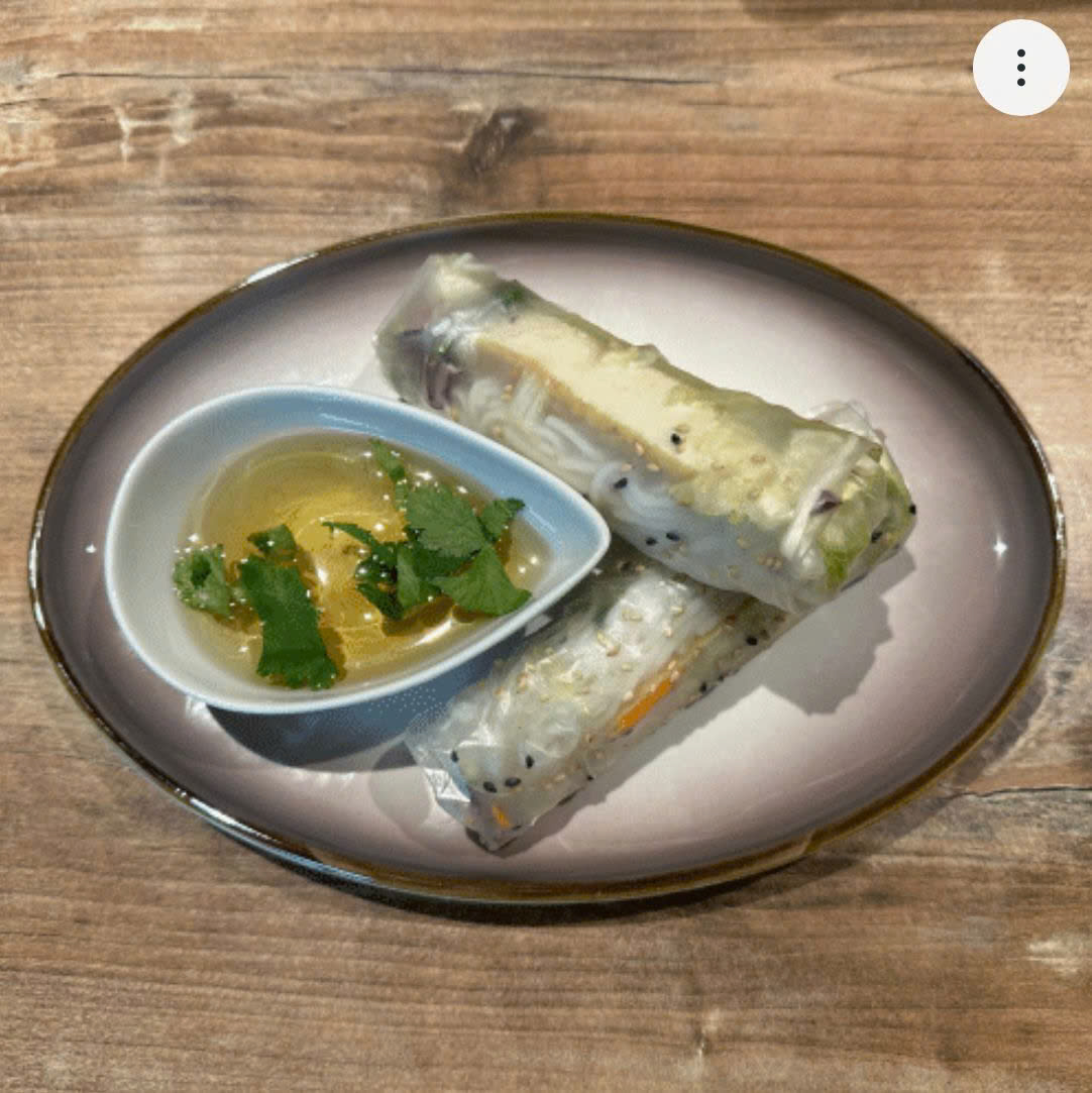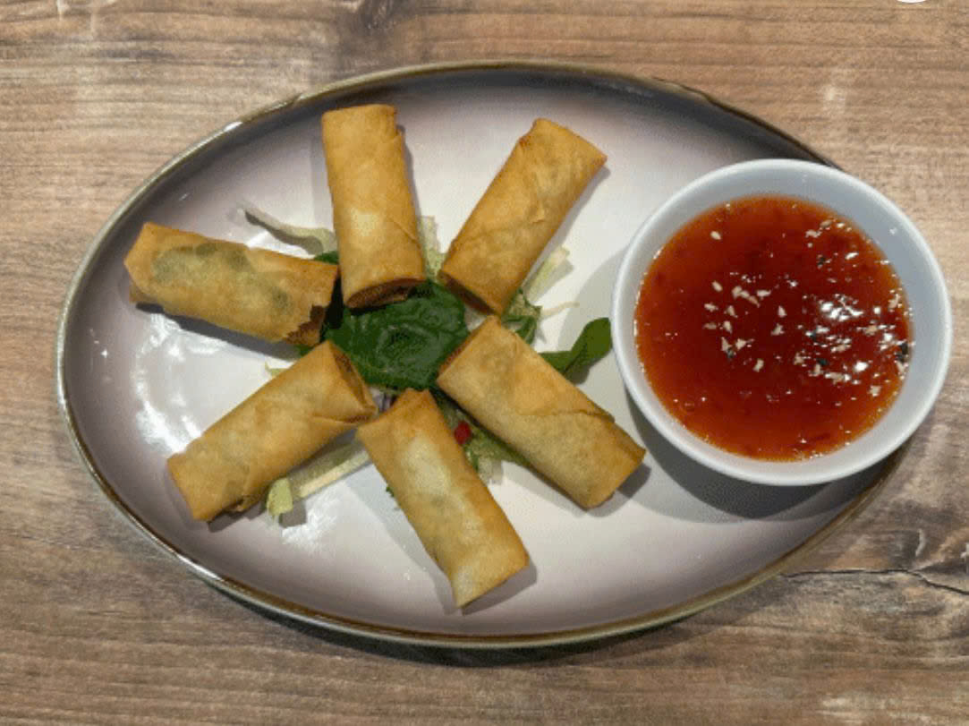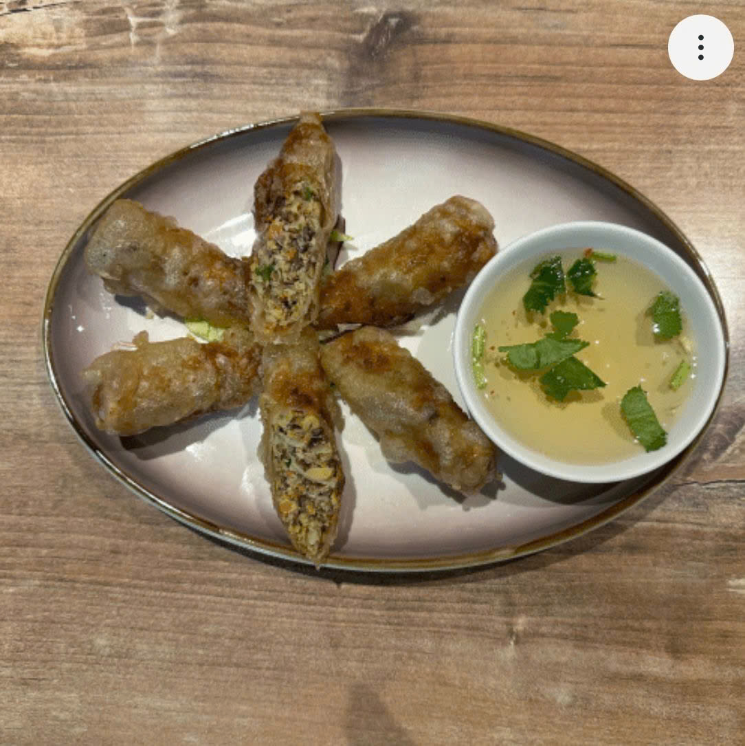 Reisnudeln und Frühlingsrollen mit Rinderhackfleisch, Sojasprossen, Salat, Minze in leckerer lngwer-Chili-Fischsoße, verfeinert mit Erdnüssen.