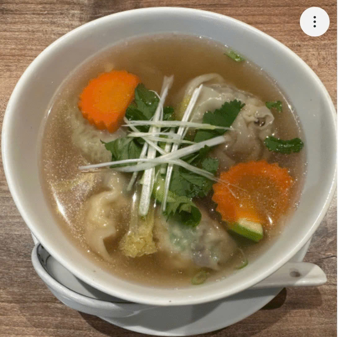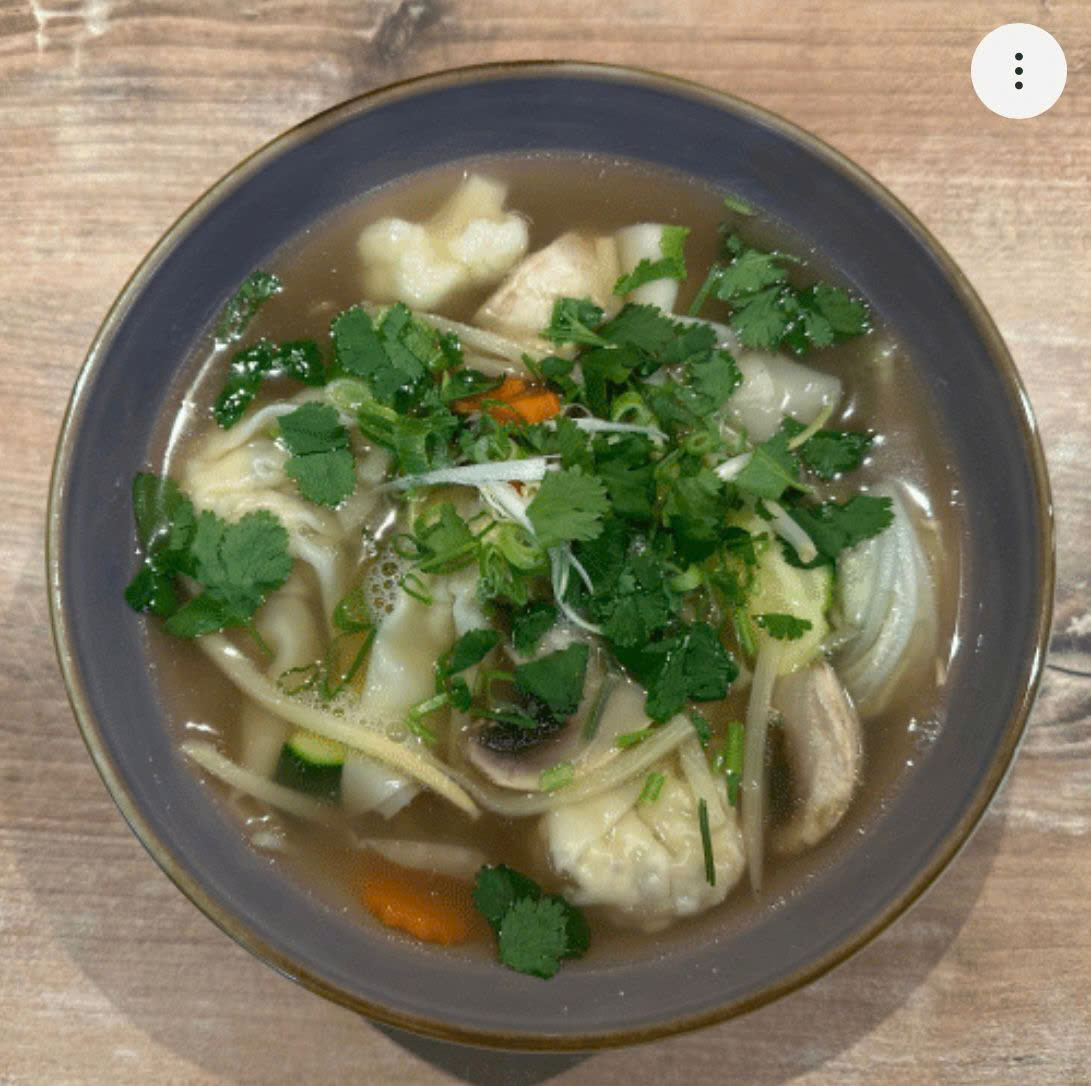 vietnamesische Nudelsuppe mit Hühnerfleischbällchen in Wantan-Teig, frischem Gemüse und asiatischen Kräutern