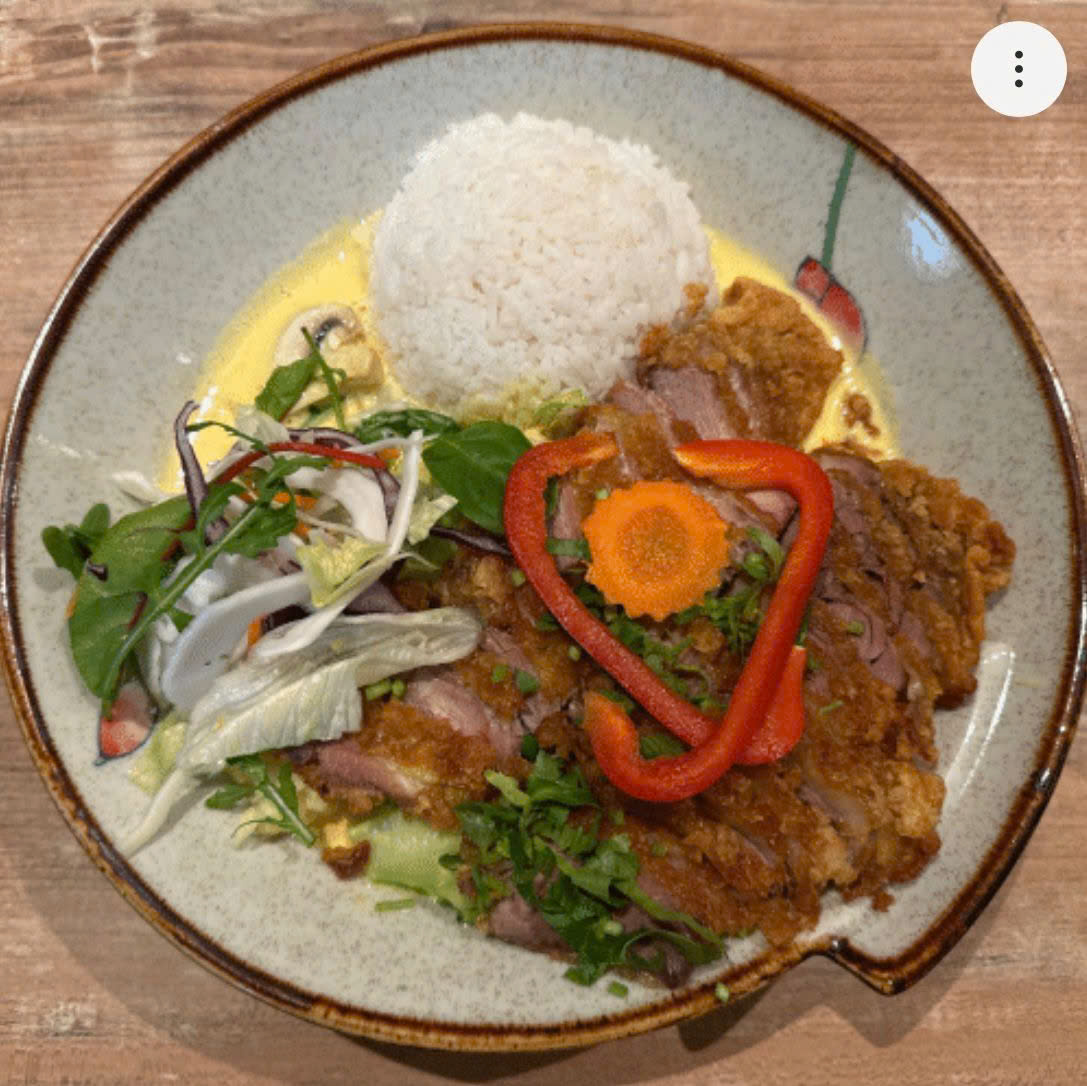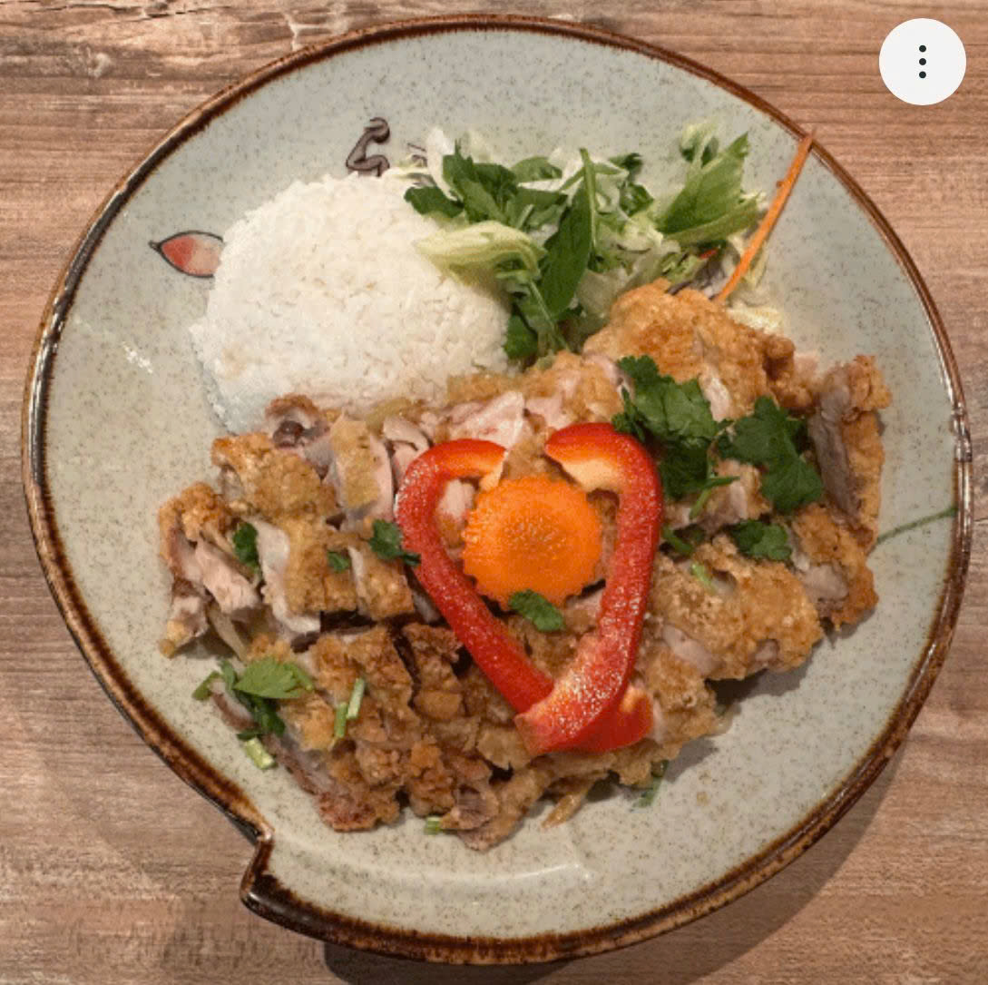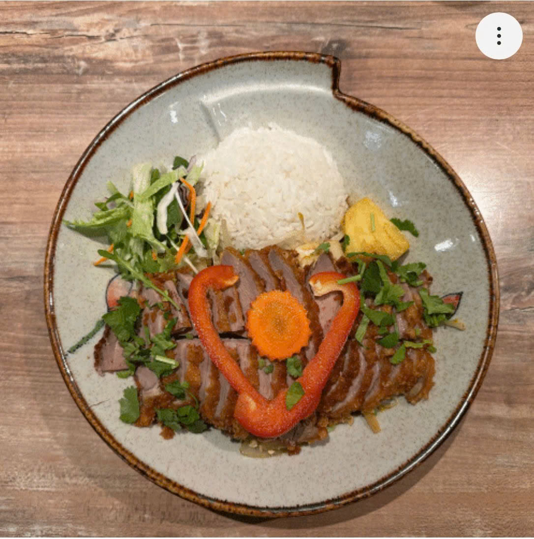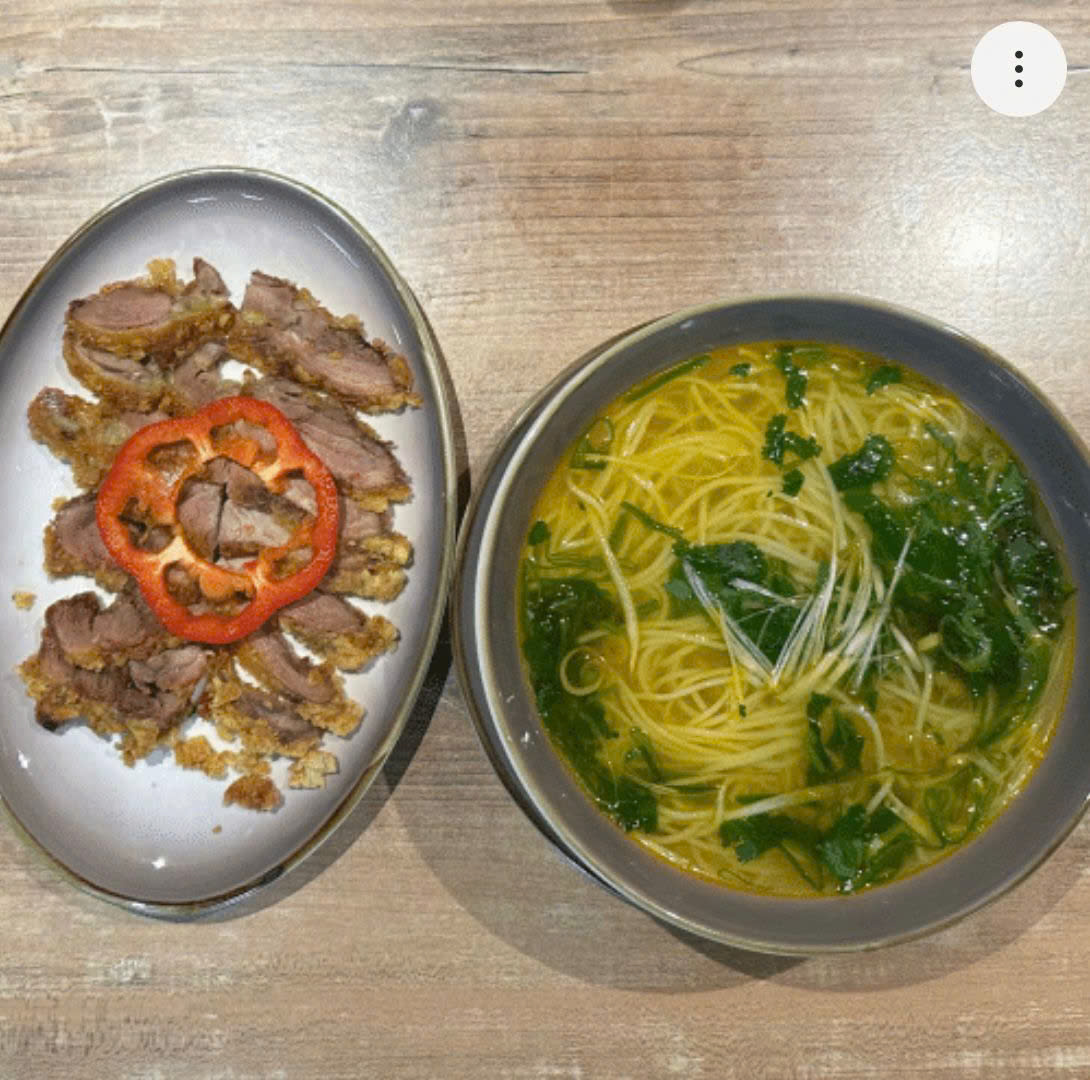 Reisnudeln mit kross gebackener Ente zubereitet in schmackhafter Brühe, verfeinert mit Koriander und Schnittlauch.
