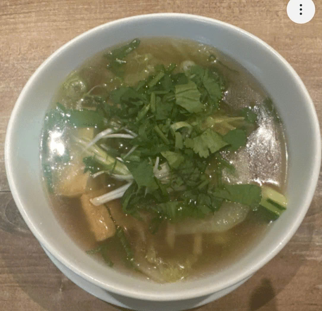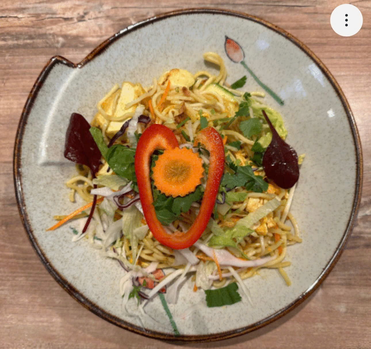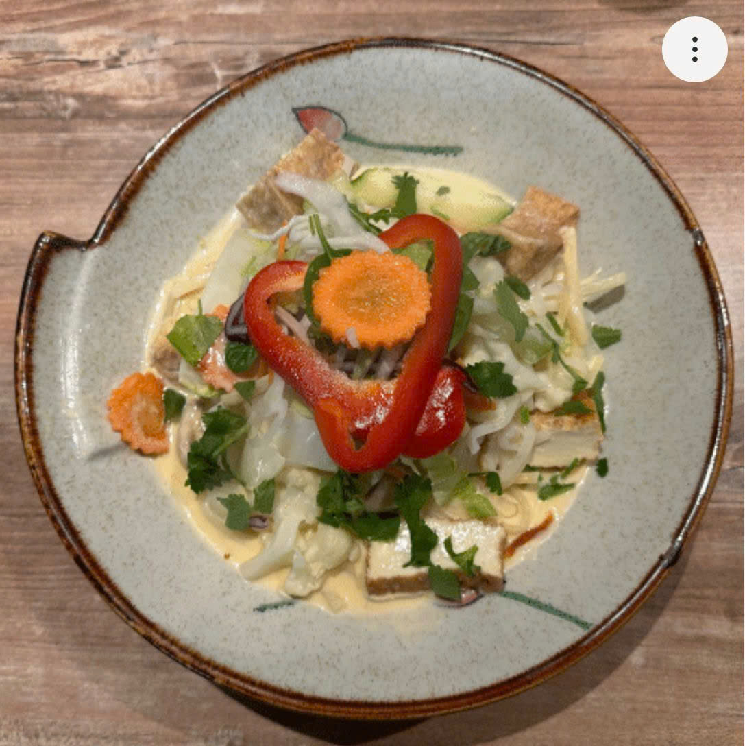 Reisbandnudeln mit Tofu zubereitet in schmackhafter Brühe, Ingwer, Sojasprossen. Verfeinert mit Koriander und Schnittlauch.