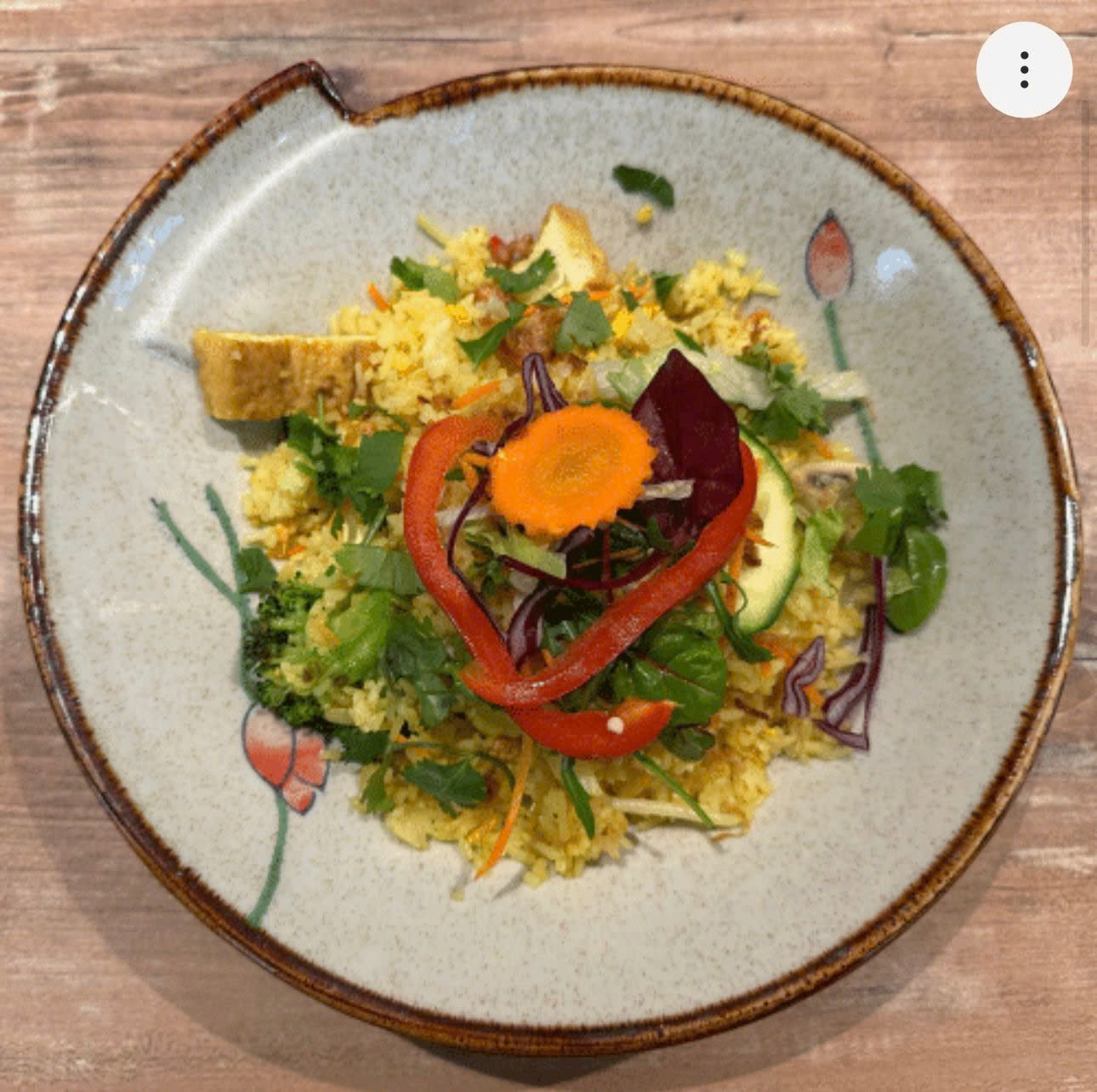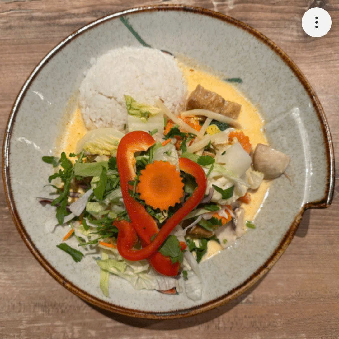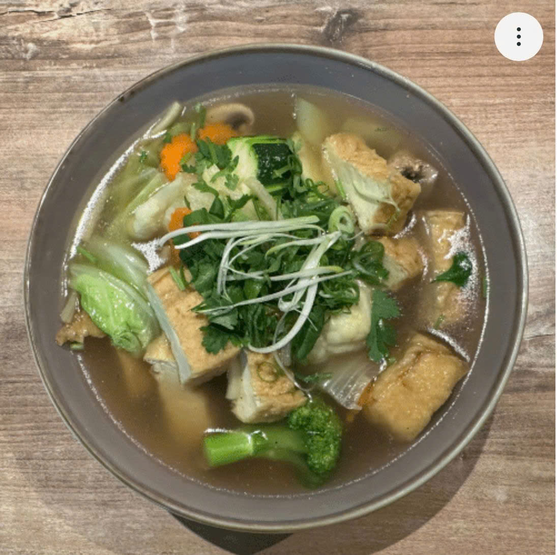 Reisbandnudeln mit Tofu zubereitet in schmackhafter Brühe, Ingwer, Sojasprossen. Verfeinert mit Koriander und Schnittlauch.