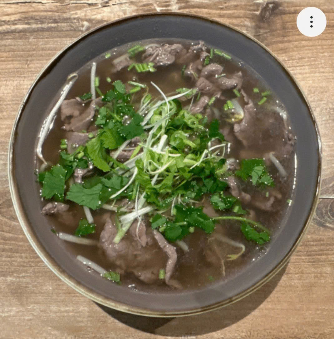 Reisbandnudelsuppe mit zartem Rindfleisch. Zubereitet mit schmackhafter Brühe, Ingwer, Sojasprossen. Verfeinert mit Koriander und Schnittlauch.