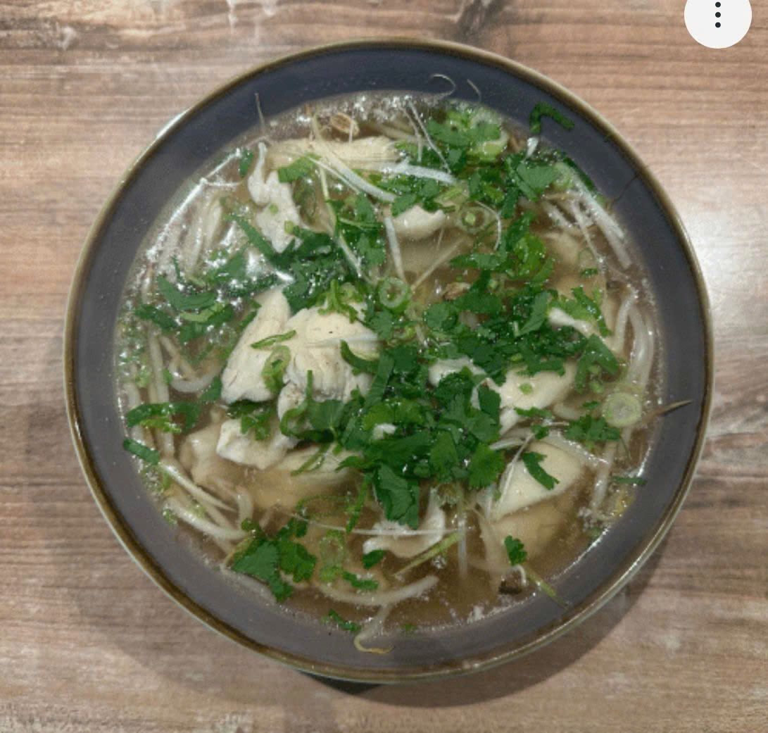 Reisbandnudeln mit Hühnerfilet zubereitet in schmackhafter Brühe mit Ingwer, Sojasprossen. Verfeinert mit Koriander und Schnittlauch.