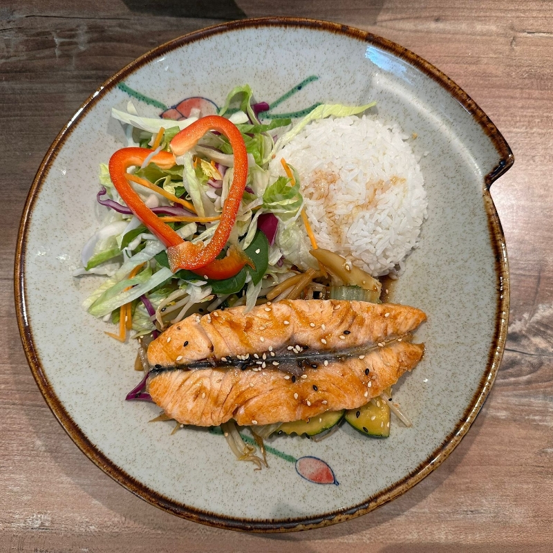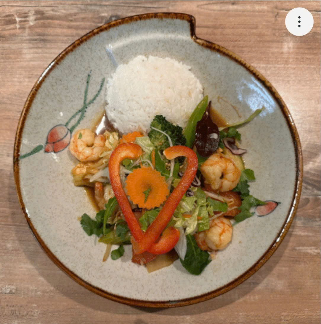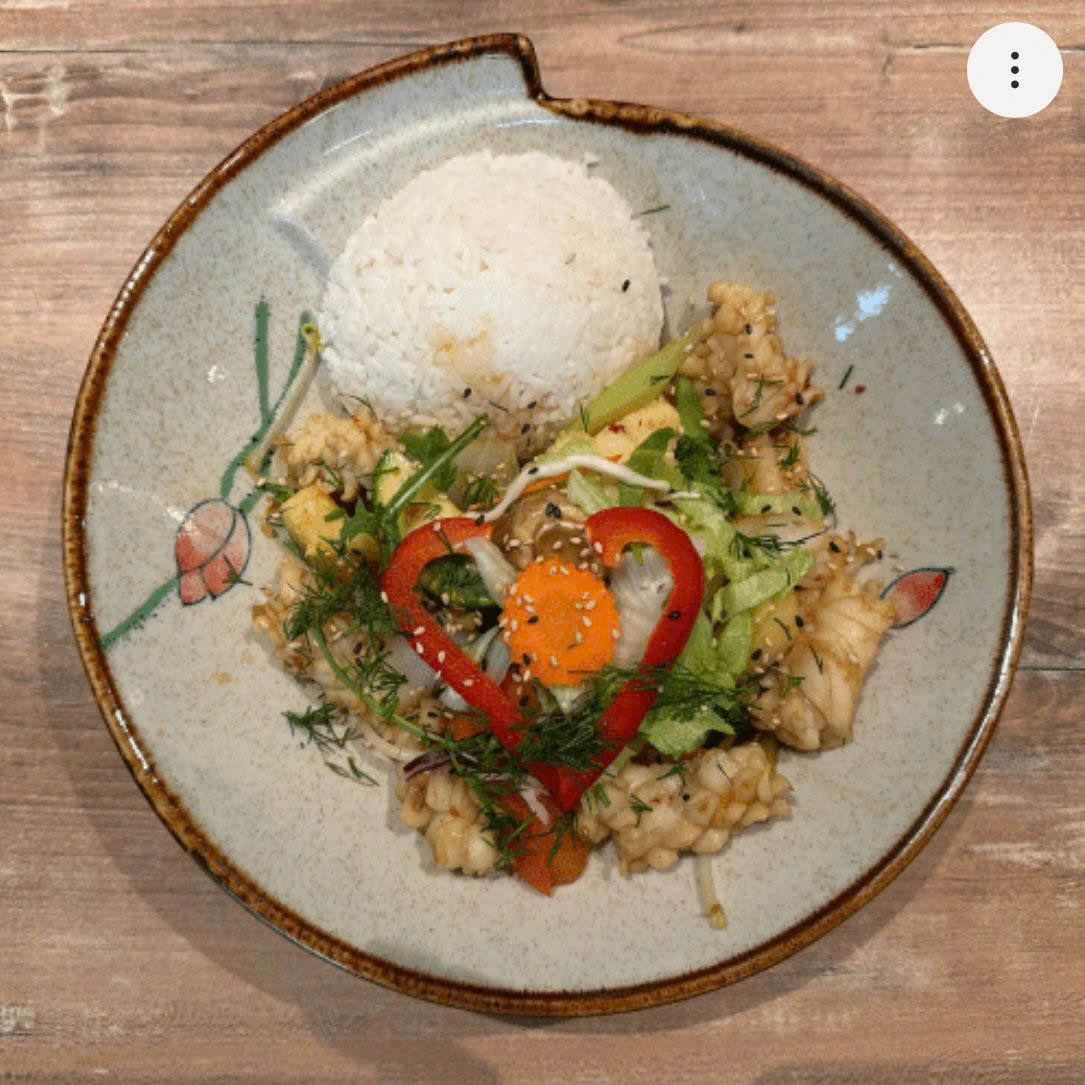 Im heißen Wok gebratener Tintenfisch mit fischen Tomaten, Ananas und Sellerie. Verfeinert mit Sesam und Koriander. Serviert mit Duftreis.