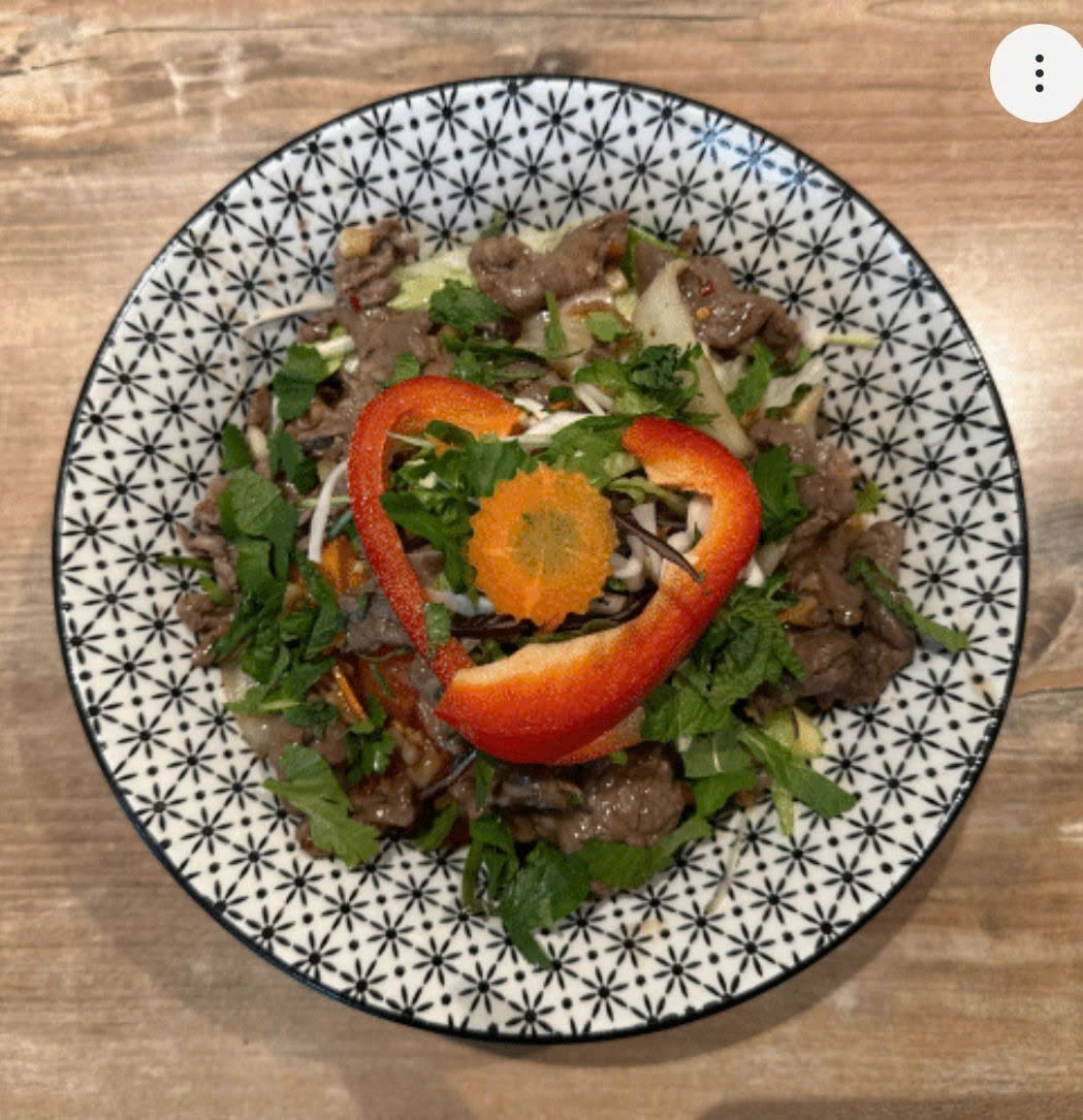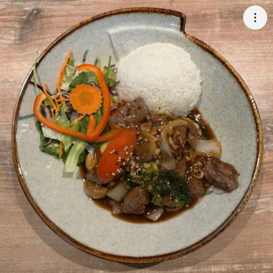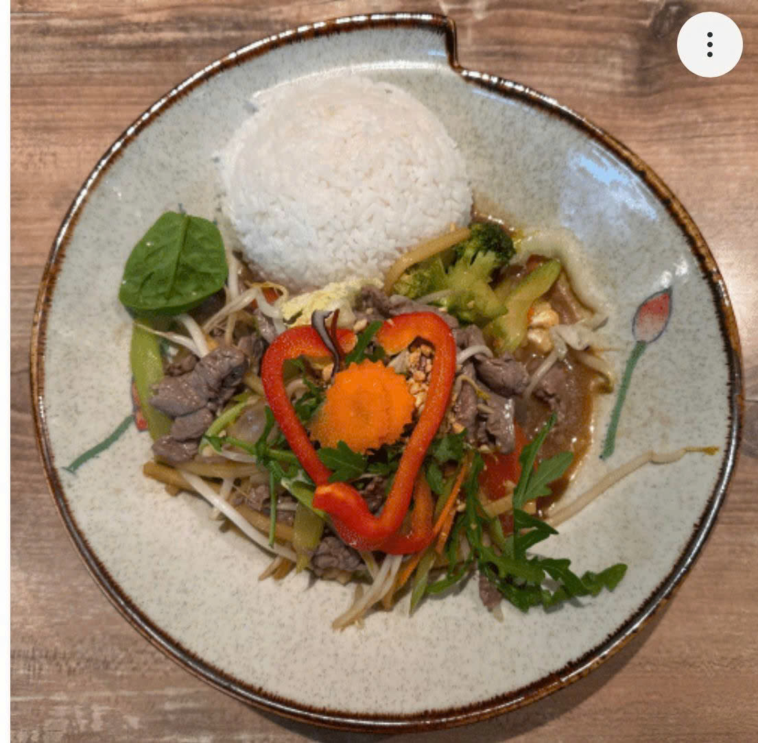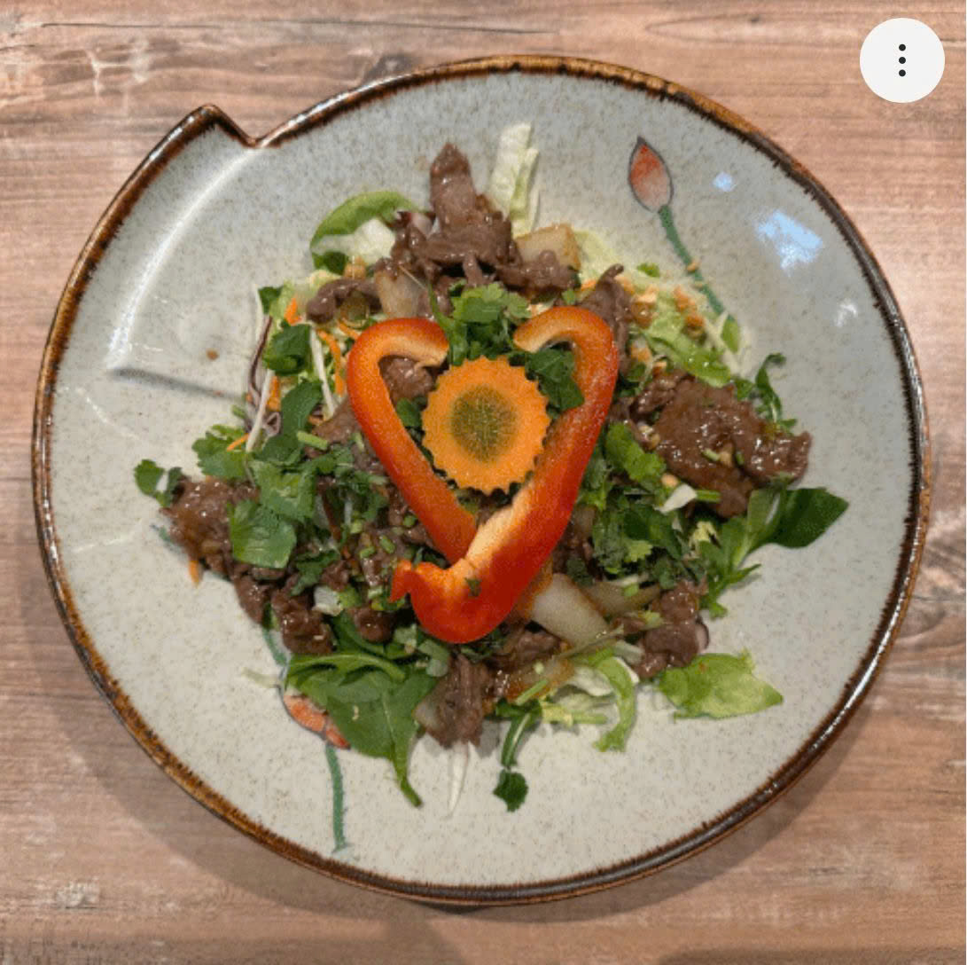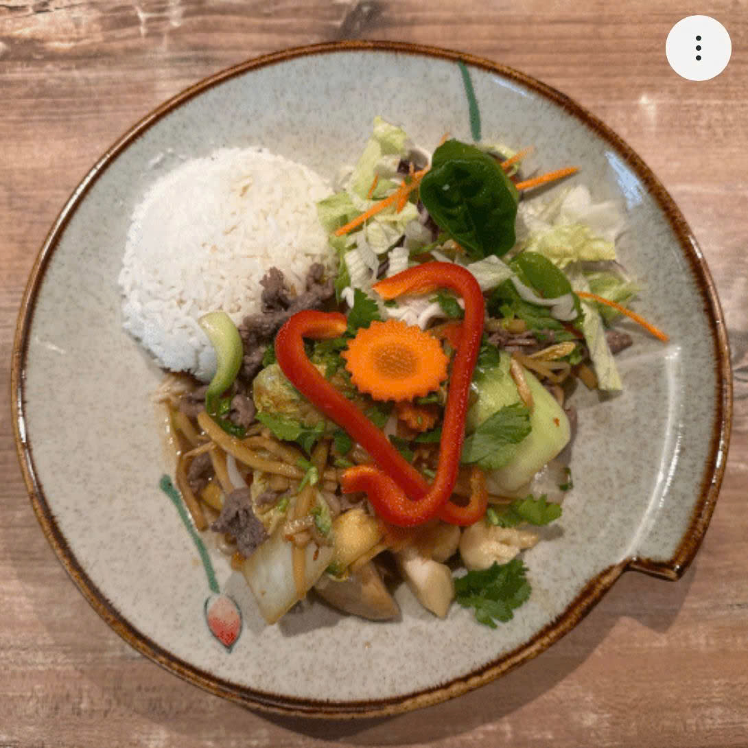 Mit Zitronengras-Chili gewürztes, zartes Rindfleisch im heißen Wok gebraten, serviert mit Reisnudeln, Salat, Sojasprossen, Basilikum in leckerer lngwer Chili-Fischsoße, verfeinert mit Erdnüssen.