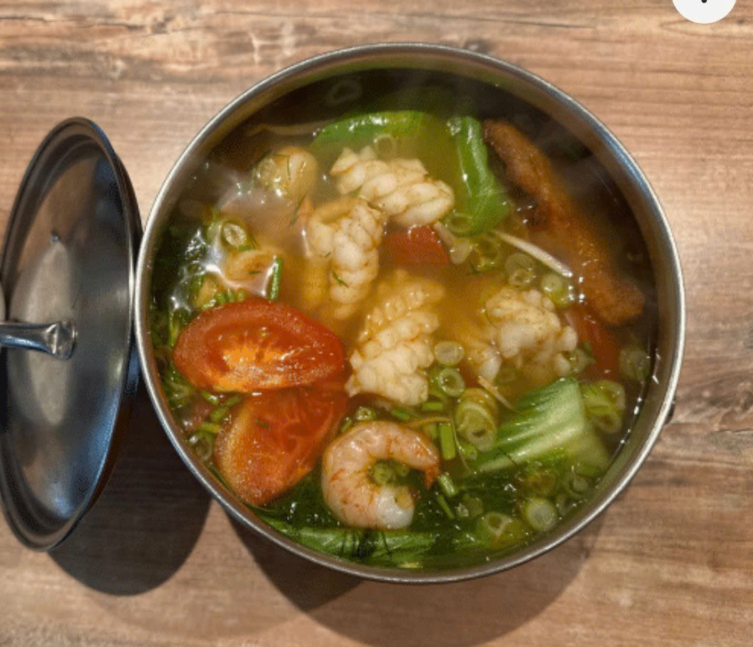 Heißer Feuertopf mit Fischfilet, Garnelen, Tintenfisch, frischem Gemüse (vietnamesischen Rhabarber, Sojasprossen, Ananas und Tomaten), verfeinert mit vietnamesischen Kräutern und Tamarinden- Brühe. Serviert mit Reisnudeln.