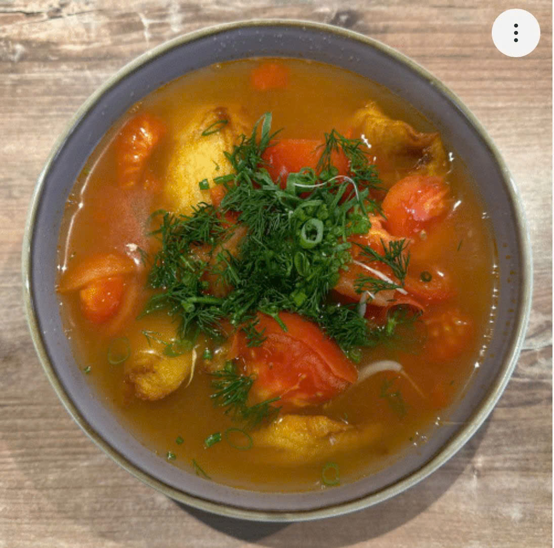 Reisnudeln mit zartem Victoria Fischfilet zubereitet mit Tamarinden-Tomaten-Brühe. Verfeinert mit Koriander und Dill.