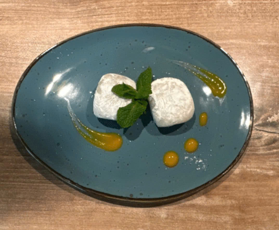 Vietnamesischen Kokoscreme mit echter Vanille, Mangopüree und gerösteten Erdnüssen